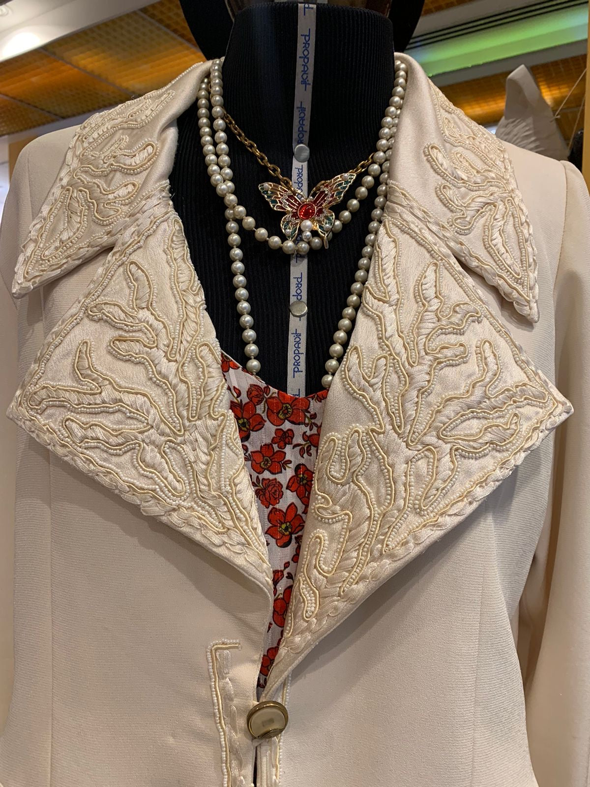 Blazer vintage off white com gola e punho bordado em canutilhos