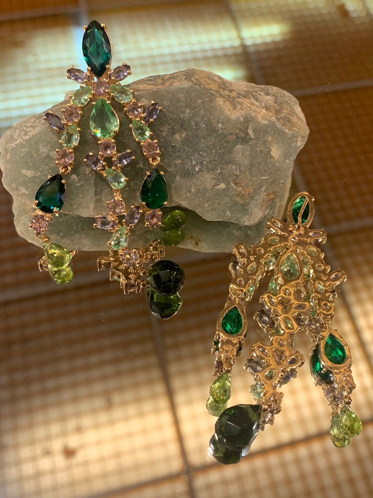 Os cristais verdes, além de seu brilho fascinante, transmitem uma energia positiva e elegante, complementando qualquer produção com uma explosão de cor e glamour.