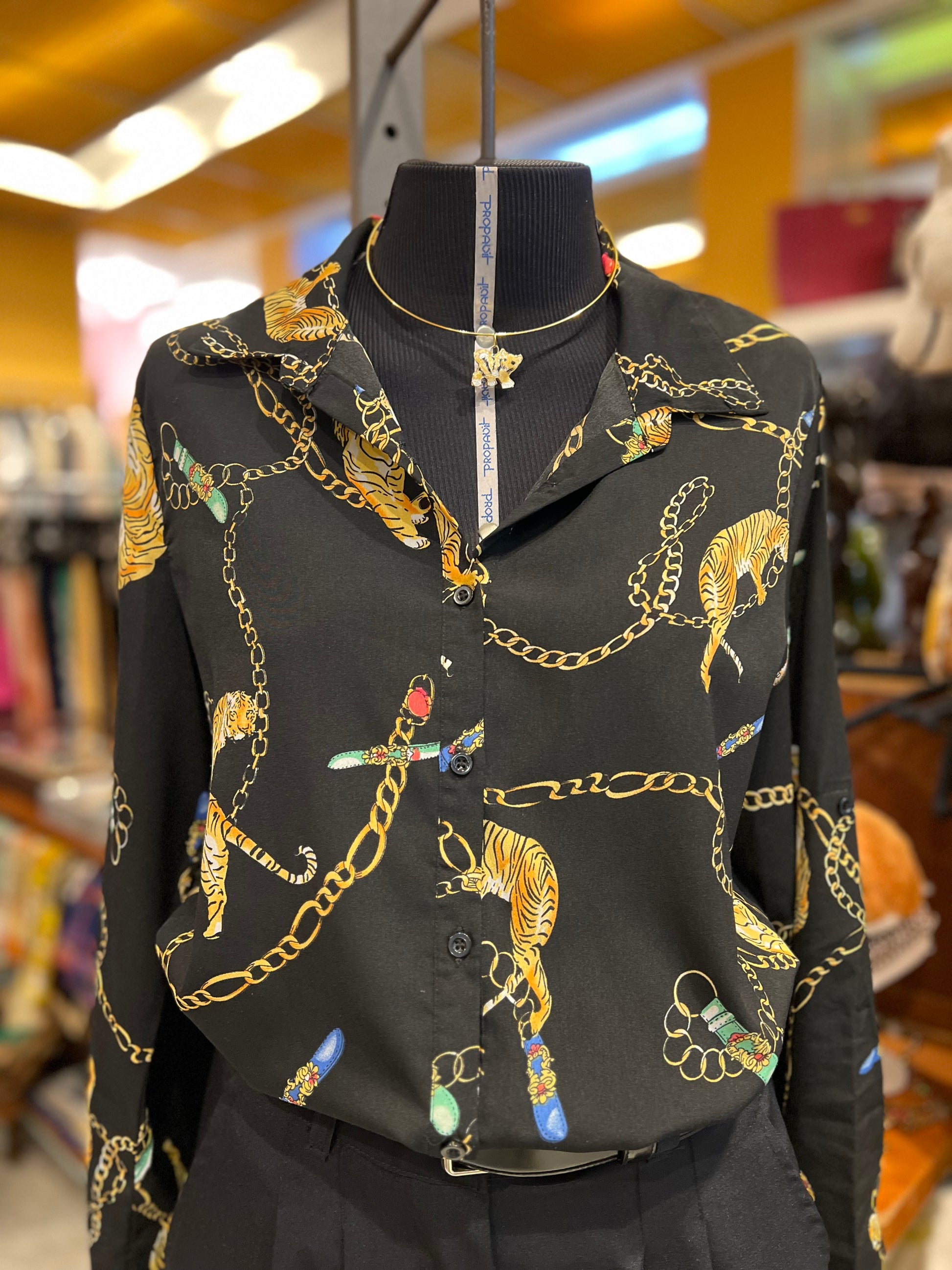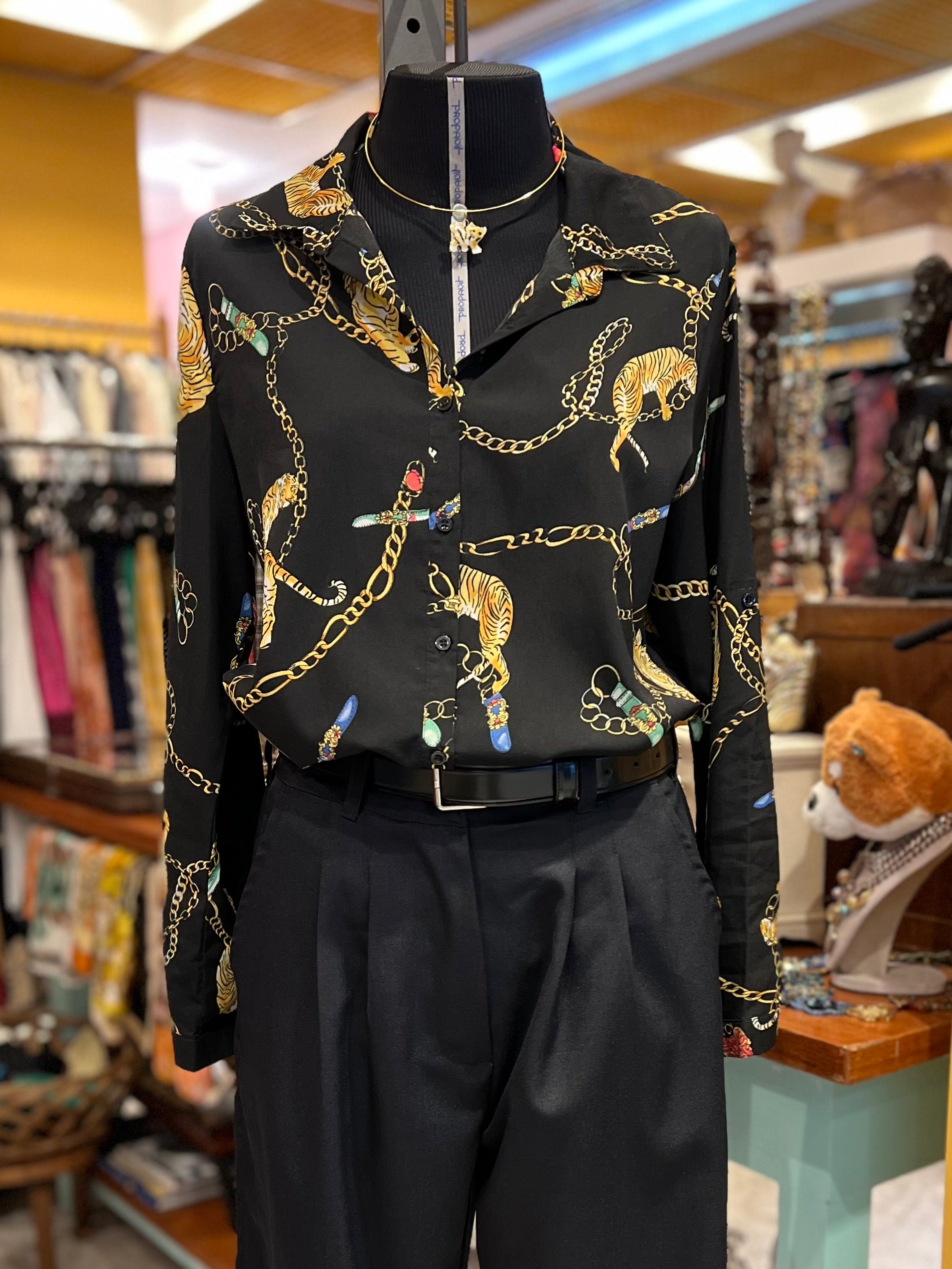 Dê um toque ousado ao seu estilo com nossa Camisa de Manga Longa Preta com Estampa de Tigre.