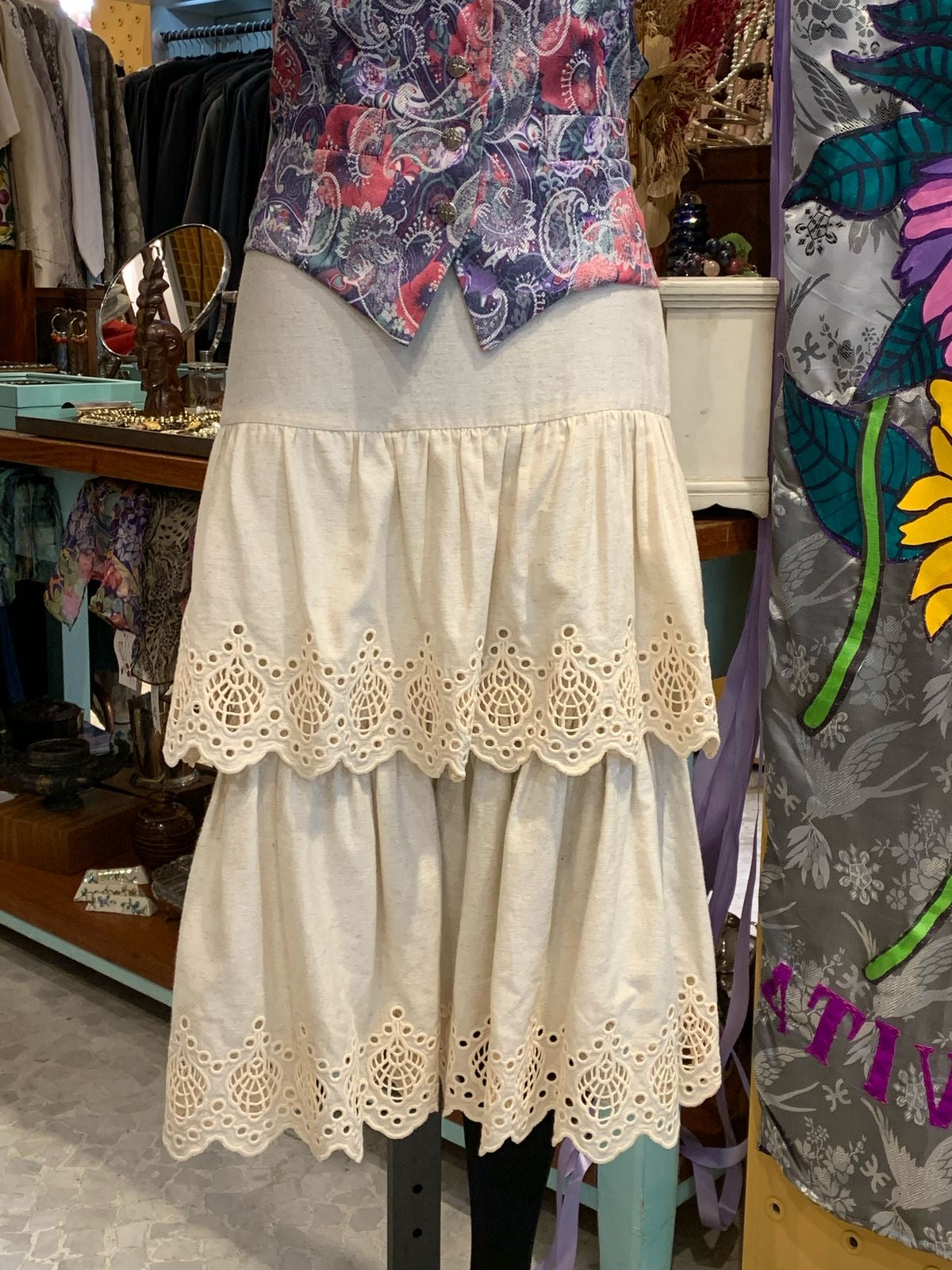 Ideal para ocasiões especiais ou para dar um toque único ao seu look diário, a saia traz um equilíbrio perfeito entre elegância e frescor. O tecido de renda, com seus detalhes intrincados, e os babados nas extremidades conferem um toque de sofisticação e romantismo, tornando-a uma peça única e versátil, que pode ser facilmente combinada com blusas simples ou tops mais elaborados.
